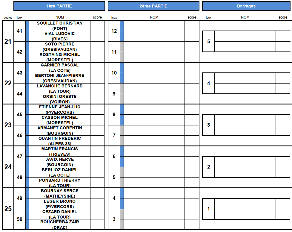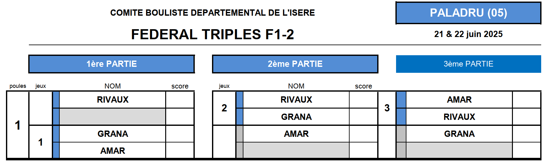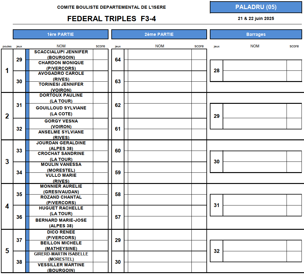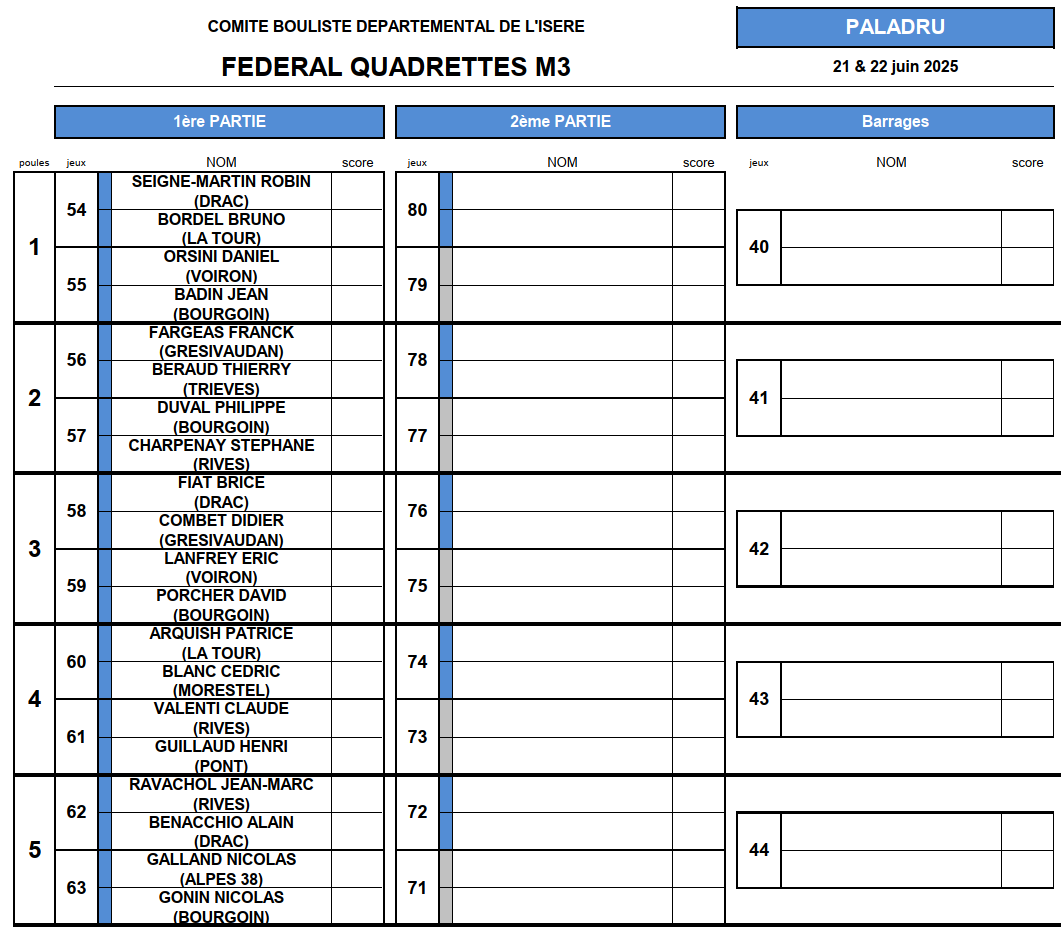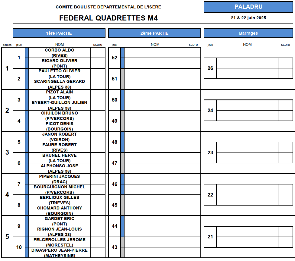 [Fédéral Quadrette / Triple 2025] Les Tirages ! lundi 16 juin 2025, par Fabien Vial F1-2 : 2 équipes qualifiées F3-4 : 5 équipes qualifiées M3 : 3 équipes qualifiées (5 équipes sont déjà qualifiées) M4 : 8 équipes qualifiées