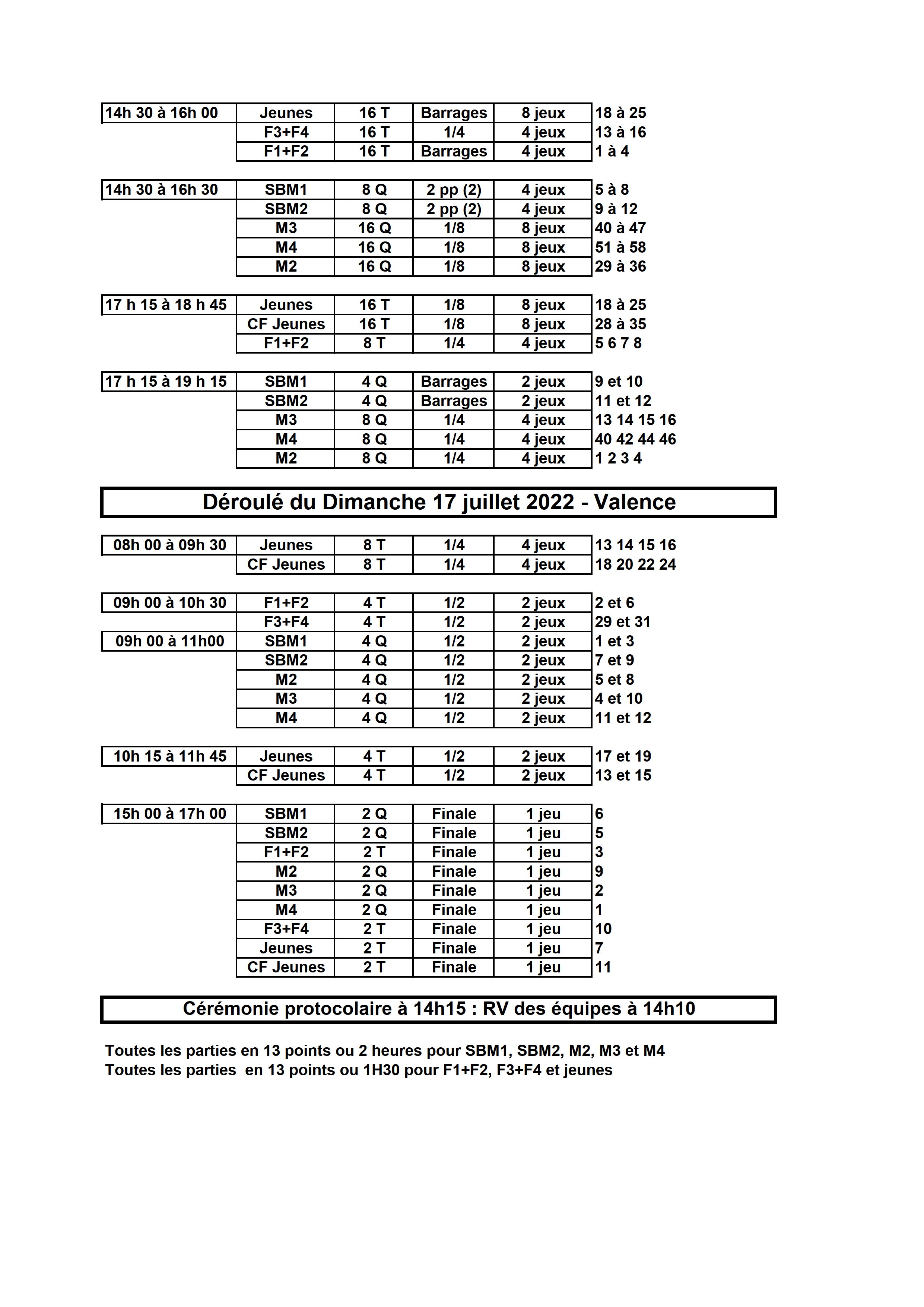 [Championnat de France Quadrettes 2022 - Valence] Les horaires (...)