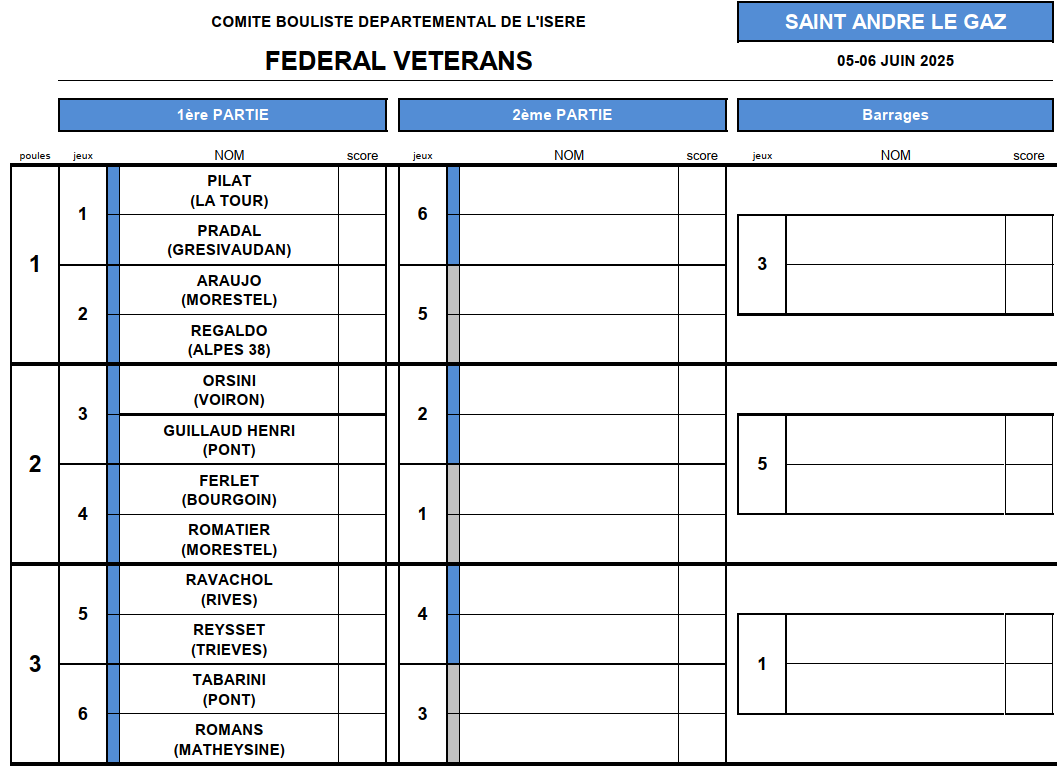 [Fédéral Vétéran Quadrette 2025] Le Tirage "Open" lundi 2 juin 2025, par Fabien Vial Ci-dessous le tirage ! 3 équipes qualifiées ! Début des parties vendredi 6 juin à 8h00 ! Pensez-également à réserver vos repas dès aujourd’hui au 06 72 99 94 66 !