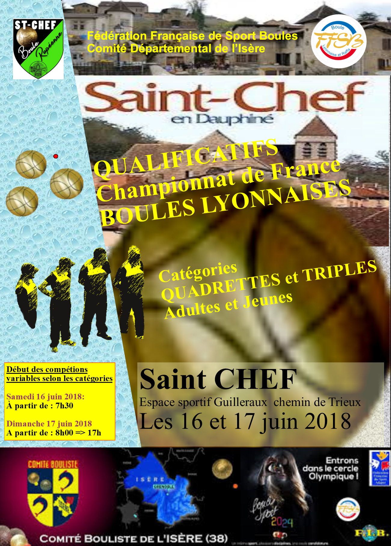 Le dimanche 17 juin 2018 pour les qualifiés du dimanche et triples jeunes, les horaires seront indiqués sur place dès le jeudi soir. Début des compétitions selon catégories à partir de 8h.