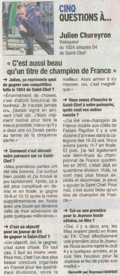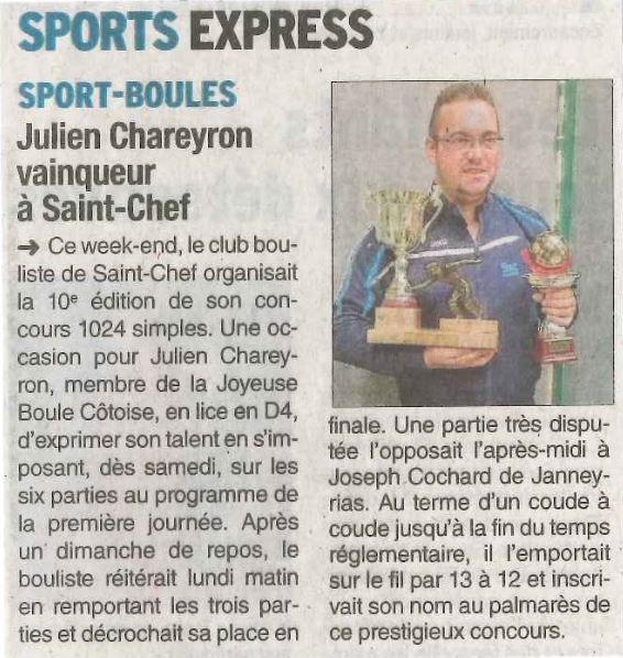 Vainqueur du 1024 Simples de Saint-Chef, le joueur de la Joyeuse Boule de la Côte Saint André figure parmi les 4 finalistes qui peuvent prétendre au trophée du Sportif du Mois de Novembre décerné par le Dauphiné Libéré.