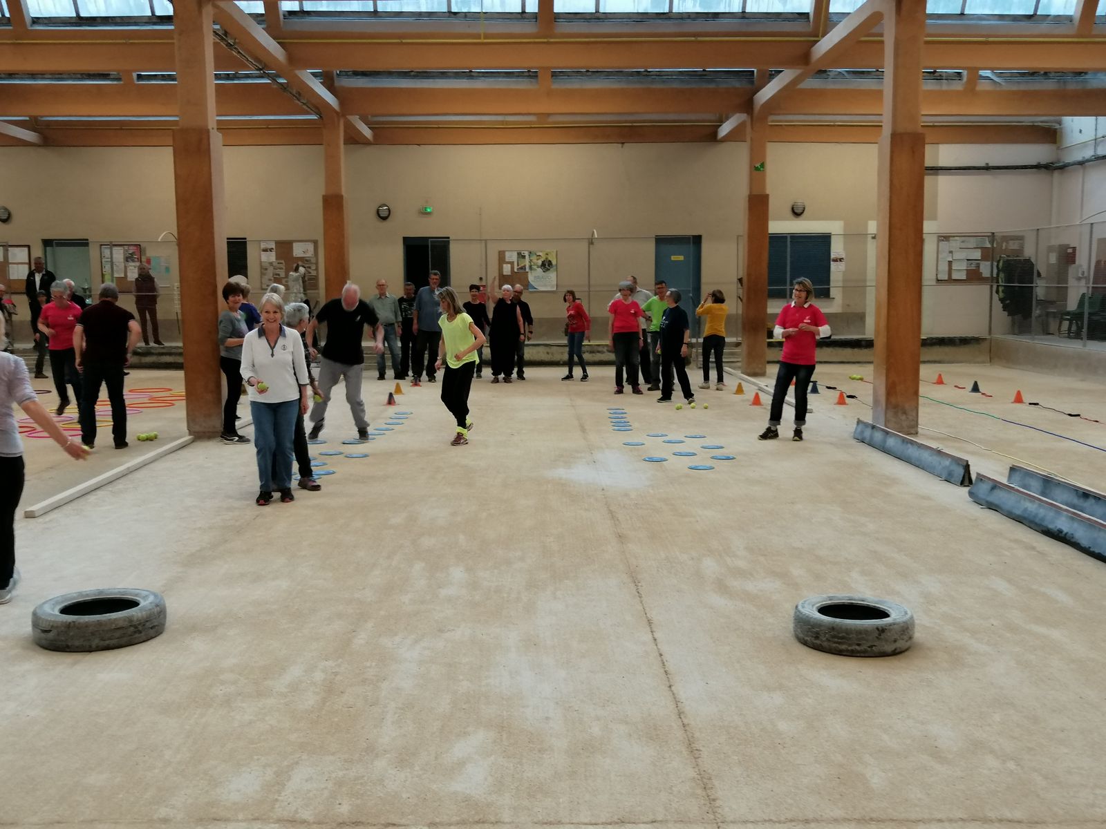 Après un échauffement complet de 30 minutes (notre photo), animé par Cathy, intervenante en gymnastique à la GV, les participants ont découvert le sport boule, en participant à des ateliers ludiques, encadrés par les dirigeants de l’AB Voreppe.