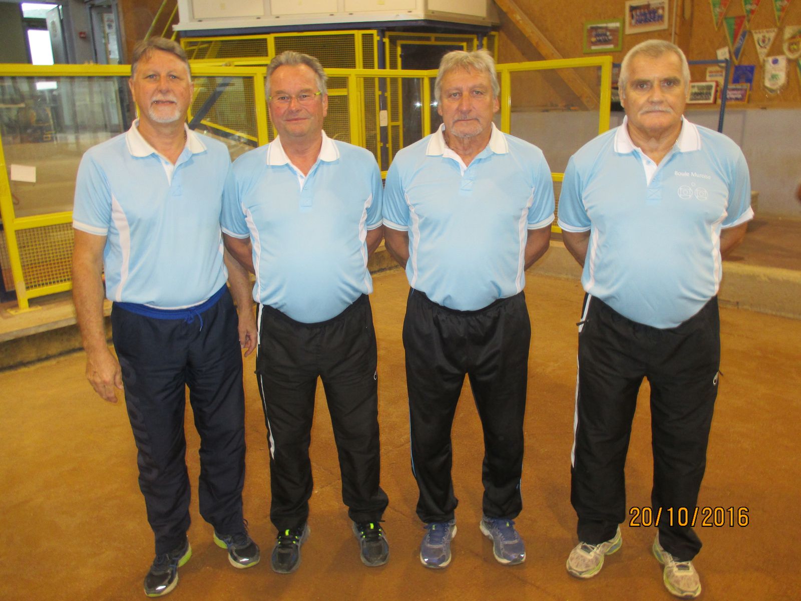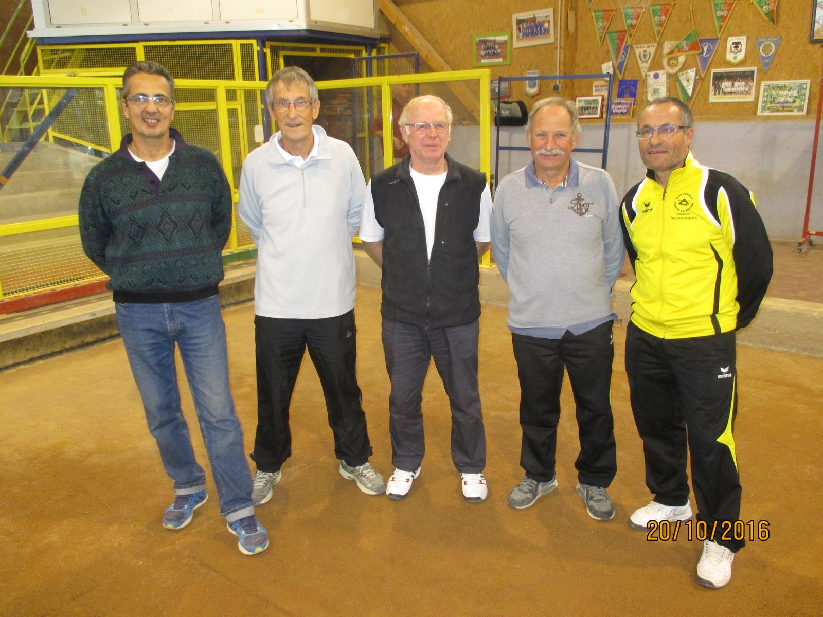 Qualifiés Masters vétérans à Pont de Claix jeudi 27 octobre 2016, par Fabien Vial HUGONIN Alain, GROS Maurice, SADIN Christian, PICCARDI Lucien, CARMONA Jésus (Izeron, St Véran, l’Albenc). ESCALON Patrick, TOURNOUD Michel, BONATO Jacky, VALLON Gérard, (Boule Muroise, Motte d’Aveillans).
