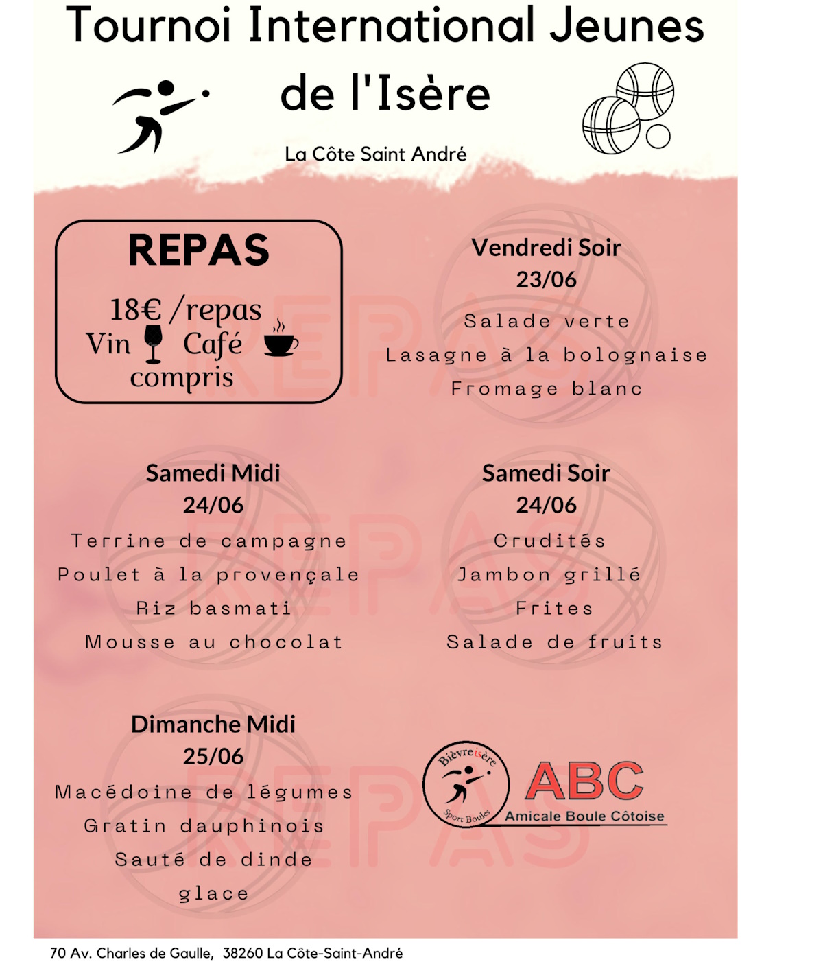 Tournoi International Jeunes à La Côte St André ! mardi 13 juin 2023, par Fabien Vial La réservation des repas peut se faire en vous inscrivant : Lien de réservation - Google Forms